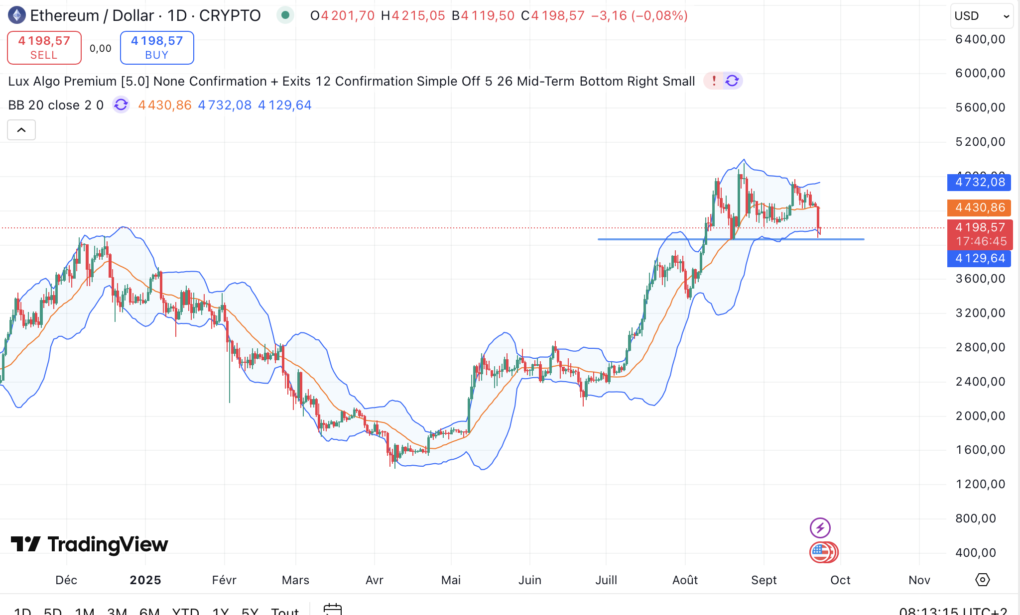 Niveaux : BTC 112 k$, 108–109 k$, 100 k$ ; ETH ~4 000 $ puis 3 60x–3 58x $ ; reprise > 4,4–4,5 k$.