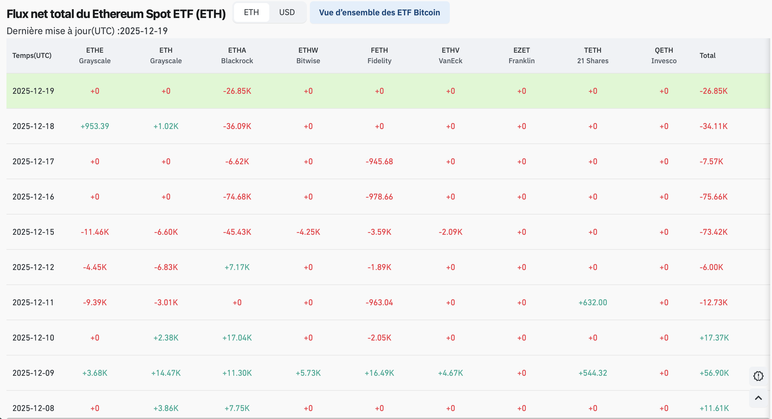 Les flux ETF ETH se stabilisent (moins de sorties, plus de régularité).