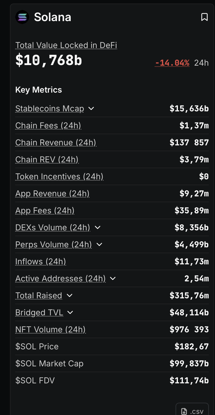 TVL ≈ $10.77B (-14 %/24h) alors que SOL -17 %/24h ⇒ baisse de TVL principalement effet prix (pas d’exode massif).